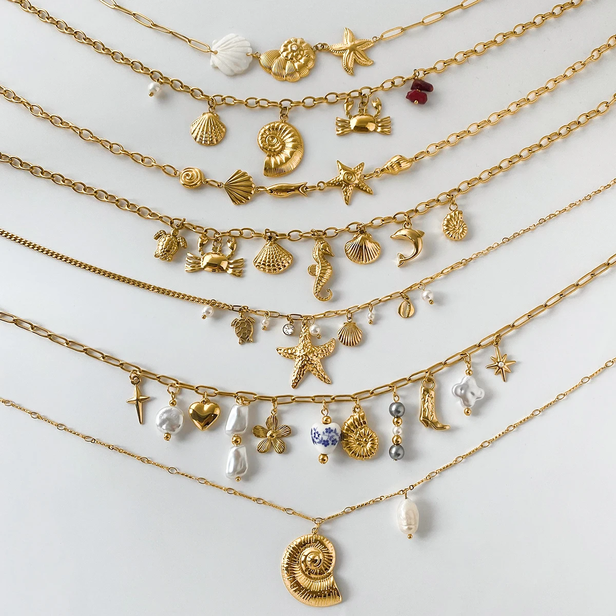 Specifications: Material: 18K PVD Gold Stainless Steel Size: As shown in the picture Weight: 25g Design and Style: Bohemian Style Multi-pendant Marine Element Shell Necklace Waterproof: Yes, stainless steel material ensures waterproofing Performance and Property: Anti-scratch, long-lasting 18K gold plating Parts and Accessories: Comes with a 18K gold-plated stainless steel chain Features: |Stainless Steel Necklace|Multi Charm Necklace| **Elegant Craftsmanship and Durability** The 2025 Bohemian Style Multi-pendant Marine Element Shell Necklace is a testament to exquisite craftsmanship and durability. Designed with a keen eye for detail, this necklace features a bohemian style that is both trendy and timeless. Each pendant is intricately crafted, boasting a marine element design that captures the essence of the ocean. The 18K gold-plated stainless steel material not only adds a touch of luxury but also ensures that the necklace maintains its luster and color for years to come. The anti-scratch properties of the material mean that your necklace will retain its pristine condition, even with regular wear. **Versatile and Adaptable Accessory** This shell necklace is not just a piece of jewelry; it's a versatile accessory that can be worn in various settings. Whether you're heading to a casual day out or a sophisticated evening event, this necklace can be easily paired with your outfit. The multi-charm design allows for personalization, making it a unique addition to your jewelry collection. The lightweight nature of the necklace, at just 25g, ensures comfort throughout the day, making it an ideal choice for those who value both style and practicality. **Adaptable and Waterproof** One of the standout features of this necklace is its waterproof nature. The stainless steel material ensures that it can withstand the rigors of daily life, including exposure to water. This makes it an ideal choice for those who lead an active lifestyle or enjoy spending time near water. The ability to stack with other necklaces adds to its versatility, allowing you to create a layered look that is both fashionable and functional. The 2025 Bohemian Style Multi-pendant Marine Element Shell Necklace is a piece that transcends trends, offering a blend of style, durability, and adaptability that is sure to captivate.